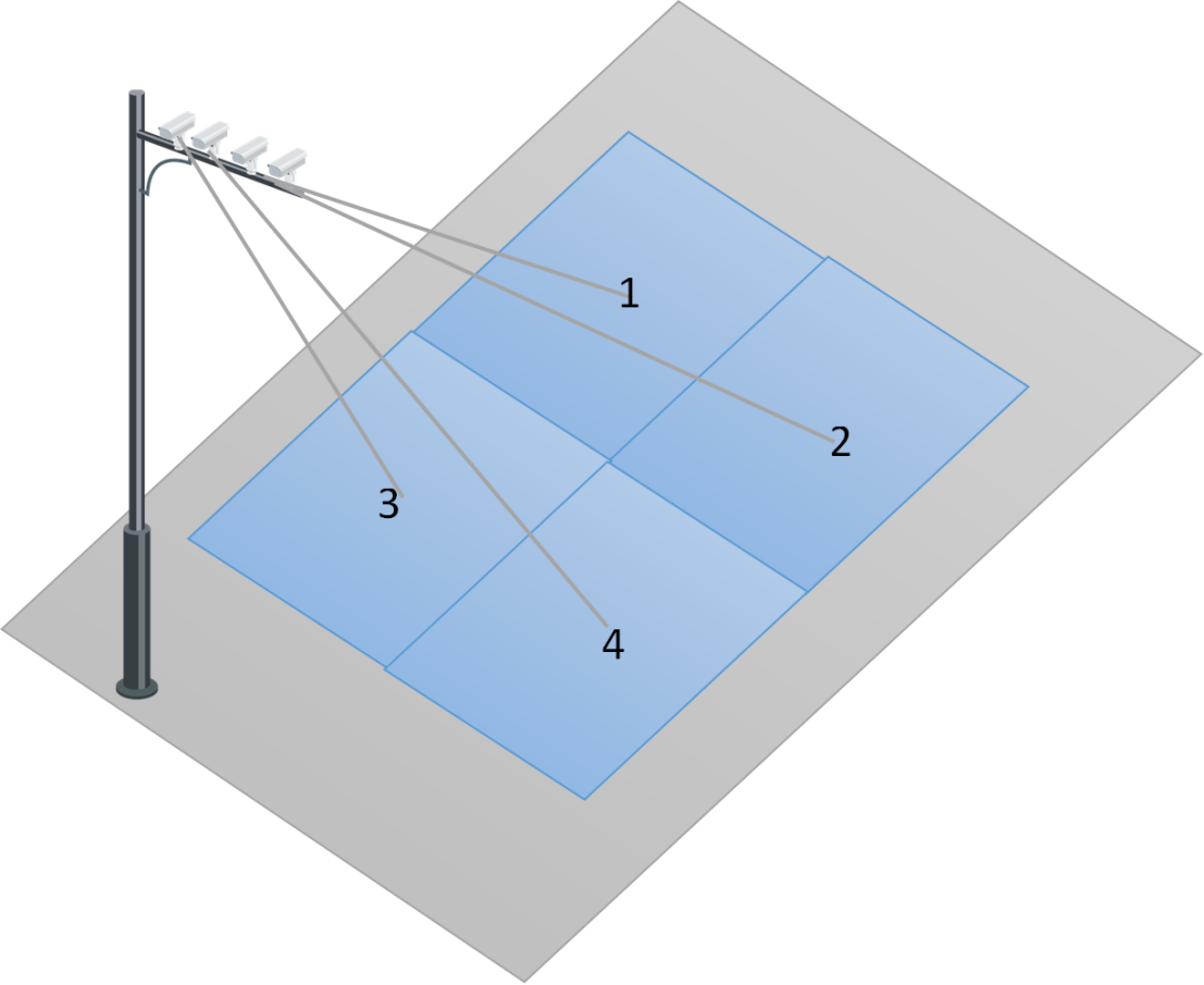 如图1所示,在高处安装若干枪机,摄像机画面覆盖区域排列成N*M的矩阵,该系统将枪机画面1、2、3、4区域进行实时拼接,将拼接后的画面输出到电视墙或大屏幕上显示,实现大场景一体化无盲区的无缝监控。此方案可用于广场,路口,大厅等面积较大的开阔区域,一个摄像机无法完全覆盖的场景。虽然鱼眼镜头的全景摄像机视场角大,但有分辨率较低,畸变较大,对距离判断误差较大等缺点。该拼接系统可在不损失分辨率的基础上,将任意摄像机的视频进行拼接,无畸变,无裂缝。