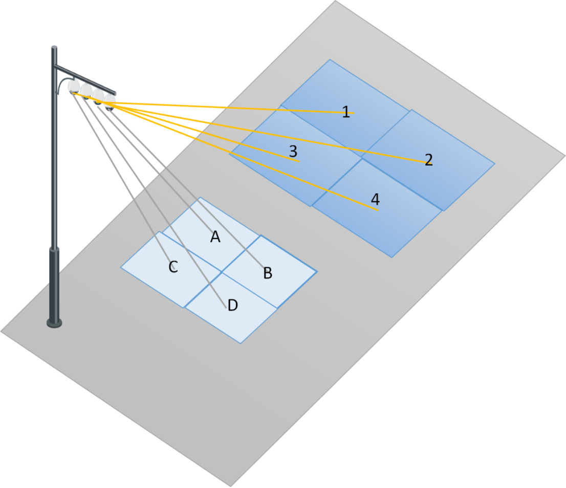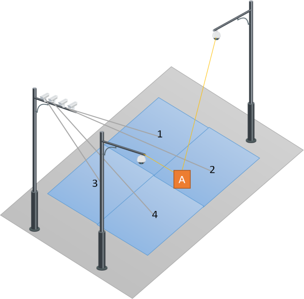 如图5所示,该方案将方案一的枪机改成了球机,较方案二减少了枪机的使用,同样可对区域1、2、3、4的画面进行实时拼接。并可根据球机设置的预置位,同时执行变倍,转动等操作,监控A、B、C、D区域,既可同时放大看细节,也可以同时缩小看整体,还可同时转动到其他区域,对另一场地进行监控,灵活多变,且永远保持拼接的无缝一体化效果,实现多场景的拼接切换。在不做拼接显示时,球机可按传统方式根据预设轨迹巡航。该方案仅需安装一套设备,便可关注整体的同时,又监控细节,根据需要动态调整拼接监控区域。