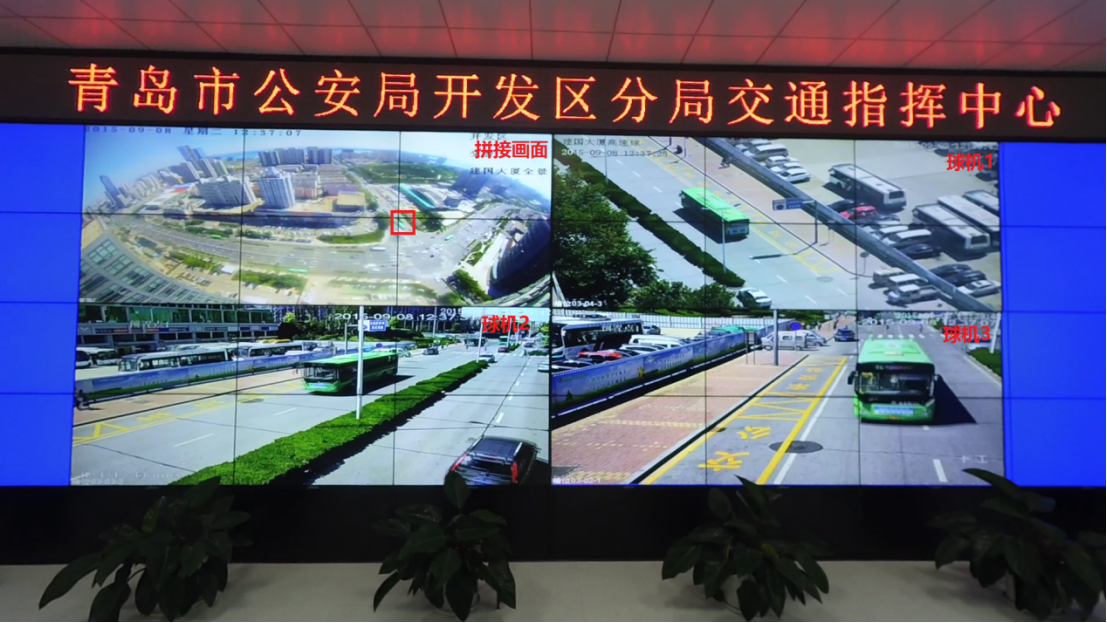 实际应用效果如图4所示,在左上角拼接画面感兴趣的区域画框后,图中红框所示,该区域附近的三个球机1、2、3会自动转动到该区域,从三个不同方向特写该区域,实现立体监控。