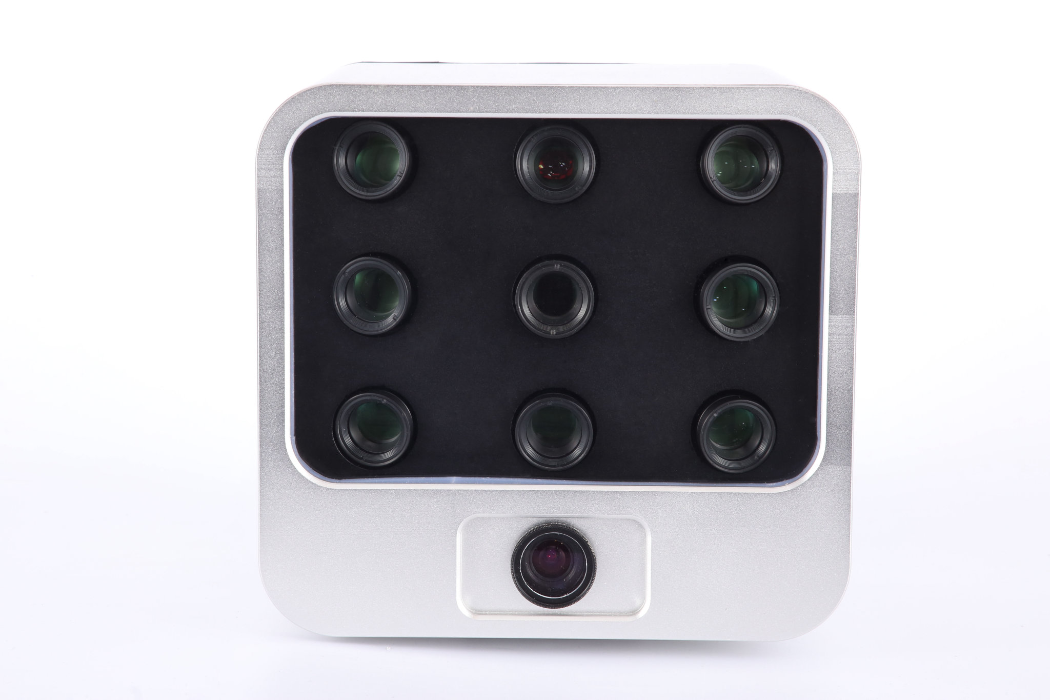 适用于大场景画面监控,完美实现九镜头画面无缝拼接成一个动态画面,有效像素大于7000万,32°可视角度,支持自动白平衡,支持录像功能,